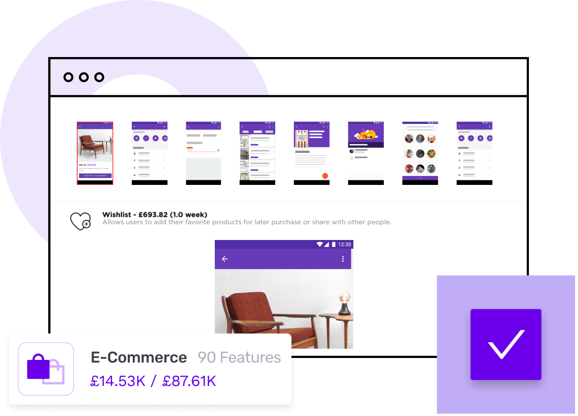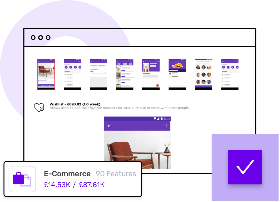 Stack our library of features (like login, push notifications or shopping cart) together, however you like. Specialists customise them – to fit your idea perfectly.